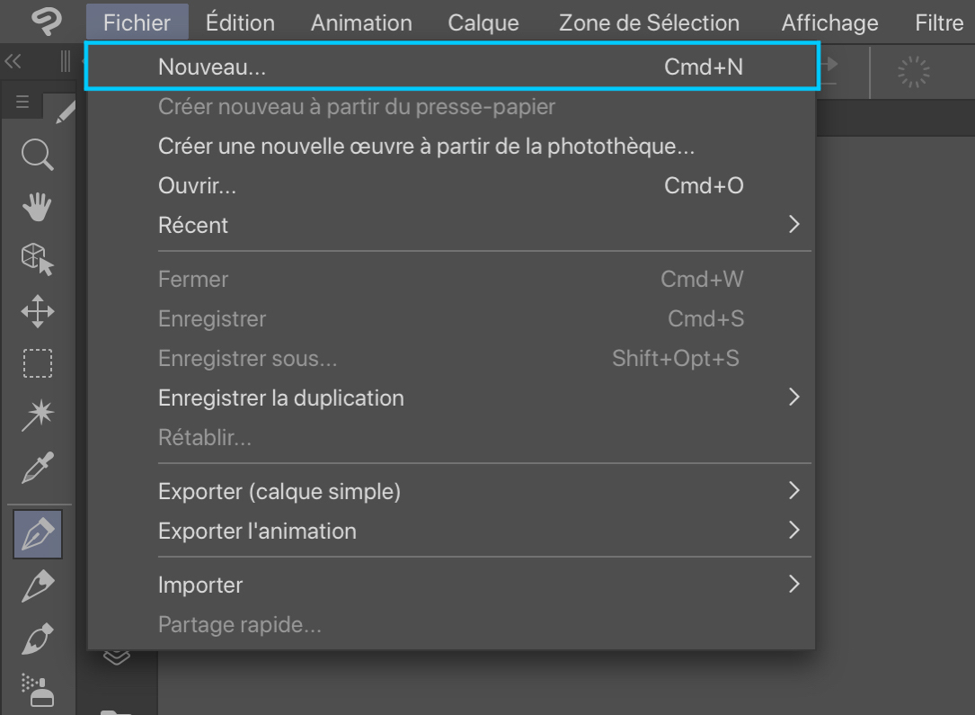 Pour commencer, il faut créer un nouveau document : Fichier > Nouveau (ou cmd + n). Dans la boîte de dialogue, je choisis les réglages pour une illustration proposés par CLIP STUDIO PAINT. Ces réglages me permettent d’obtenir une page blanche sans avoir les limites de découpe des bords perdus.