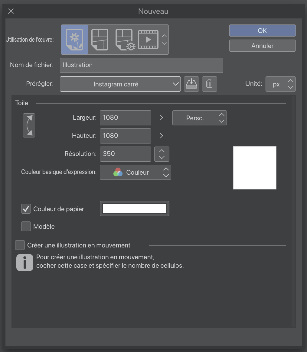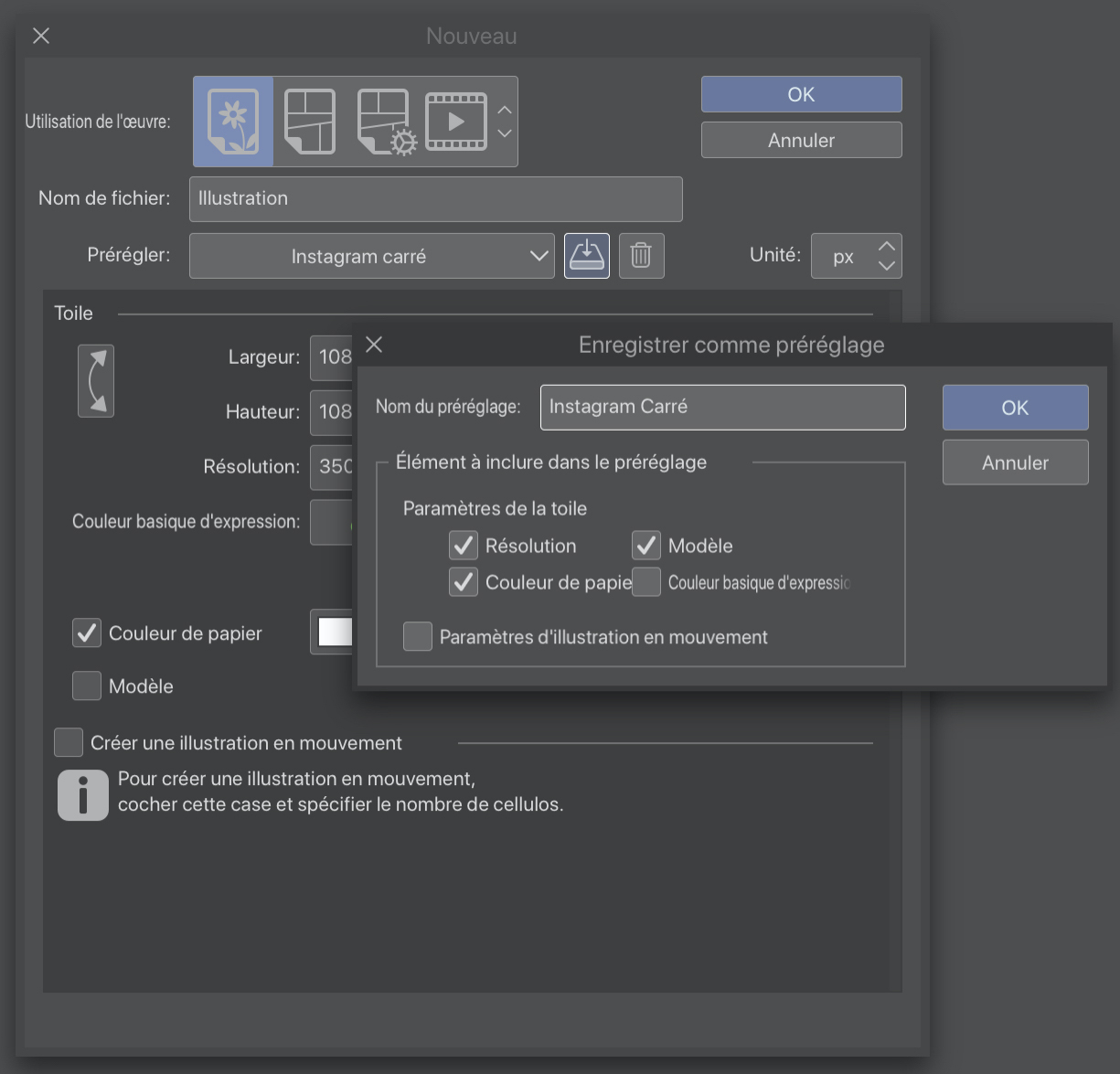 Avant de commencer à dessiner ma case, je sauvegarde les paramètres de mon illustration pour ne pas avoir à les renseigner à nouveau. Dans la boîte de dialogue qui s’affiche, je nomme ce réglage « Instagram Carré », je coche Modèle et Couleur de papier puis je clique sur OK. Mon réglage apparaît désormais dans le menu déroulant Prérégler.