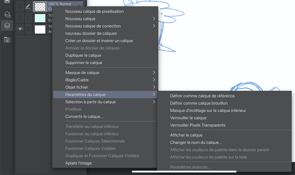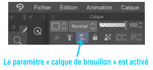 Pour terminer le paramétrage de mon calque, j’indique qu’il s’agit d’un calque de brouillon. Ainsi, je peux organiser mon travail. Pour cela j’appuie sur l’icône des calques dans la barre latérale. Dans le menu des calques, je fais un appui long sur mon calque puis dans le menu déroulant qui s’affiche je sélectionne : Paramètres du calque > Définir comme calque brouillon. Je peux également appuyer sur l’icône prévue à cet effet.