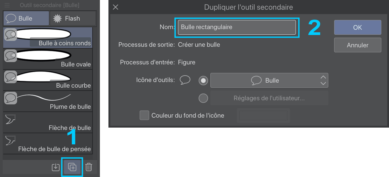 Ensuite, je sélectionne l’outil secondaire Bulle et j’ouvre l’onglet des options afin de changer le design de ma bulle. Je sélectionne l’option Bulle ovale. J’utilise souvent des bulles carrées ou rectangulaires sur Instagram. Pour créer une nouvelle forme de bulle, il suffit d’appuyer sur l’icône prévue à cet effet en bas de la fenêtre des outils (1). Il faut ensuite de modifier le nom (2), d’appuyer sur OK puis de changer les paramètres de l’outil. Je peux maintenant utiliser mon stylet afin de tracer la bulle.