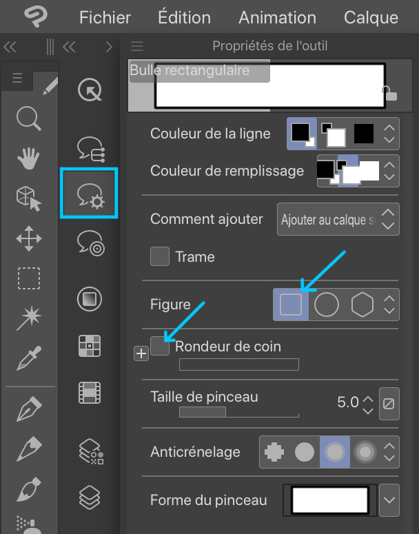Attention à bien décocher l’option Rondeur de coin si vous souhaitez obtenir une bulle bien rectangulaire.