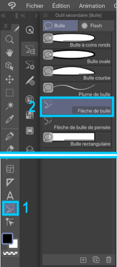 Pour finir, je sélectionne, dans les options de l’outil Bulle l’outil secondaire Flèche de bulle afin de créer la queue qui va indiquer quel personnage est en train de parler. Il est possible de sélectionner une flèche de bulle classique ou une flèche de bulle de pensée. Je trace ma flèche au stylet.