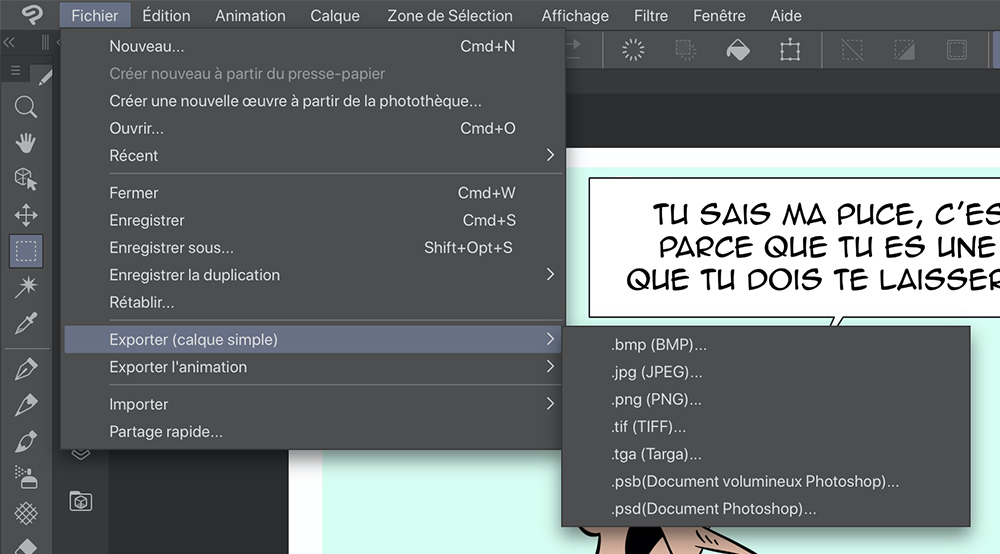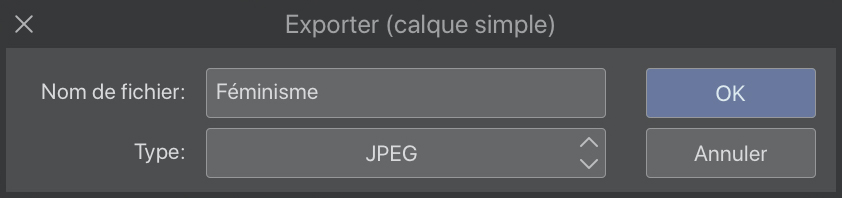 Pour finir, j’exporte mon dessin afin de pouvoir le publier sur internet. Pour cela je choisis : Fichier > Exporter (calque simple)> .jpg (JPEG).