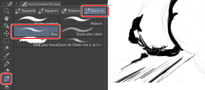 Dans le nouveau calque, j’utilise un stylo de taille moyenne, le Crayon rugueux, en noir pour commencer à dessiner le volume de l’explosion.