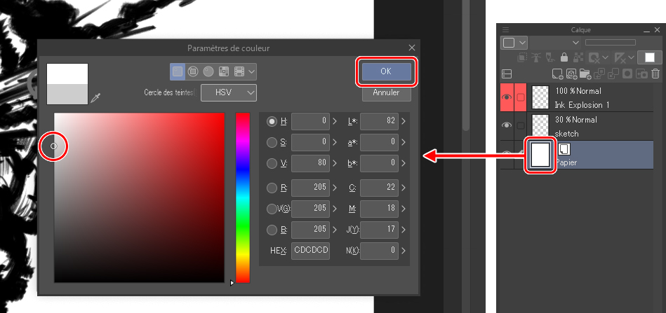 Note : Avant d’enregistrer une illustration avec des zones transparentes au format PNG, n’oubliez pas de masquer d’abord le calque de papier (Papier).