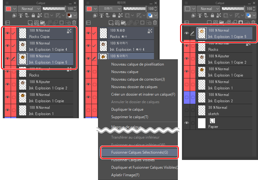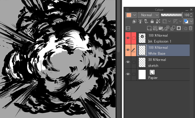 Pour finir d’encrer cette explosion, je fusionne les calques Ink Explosion 1 et White base. Je sélectionne les deux calques, je clique avec le bouton droit de la souris et je choisis Fusionner Calques Sélectionnés dans le menu contextuel. Dans le calque qui en découle, je reviens sur les détails en noir et blanc pour finir de construire le volume de l’explosion.