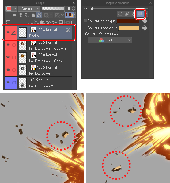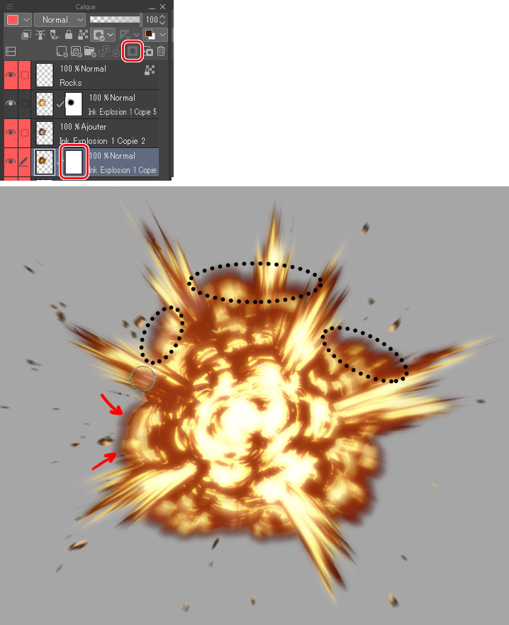 Avant de passer à l’étape 4, je vais ajouter des débris pour renforcer et simuler une véritable explosion. Vous pouvez effectuer cette étape directement sur le calque actuel ou en créer un nouveau juste pour les débris. Je conseille la deuxième option. Je crée un nouveau calque, je le renomme et je lui attribue une nouvelle couleur. Ensuite, je dessine des rochers de différentes tailles autour du feu.