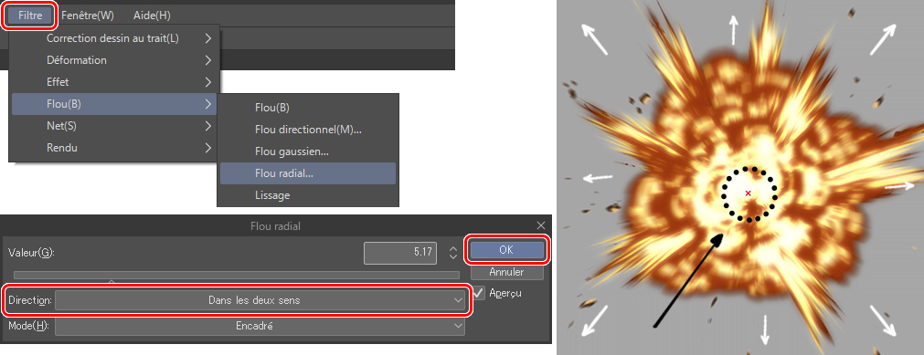 C’est maintenant que j’applique le nouveau flou. Cette fois, j’utilise Flou radial. J’ai défini une distance d’environ 5px dans une direction vers l’extérieur. Gardez à l’esprit que la croix rouge qui apparaît sur la toile doit être située au centre de l’explosion. Cliquez dessus et faites-le glisser vers la position souhaitée.