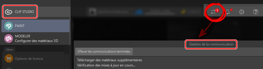 La fenêtre CLIP STUDIO s’ouvre automatiquement. Une fois que vous êtes connecté (au cas où vous ne l’auriez pas été), une notification apparaîtra sous l’écran Gestion de la communication, et vous verrez que votre matériau 3D a été téléchargé avec succès.