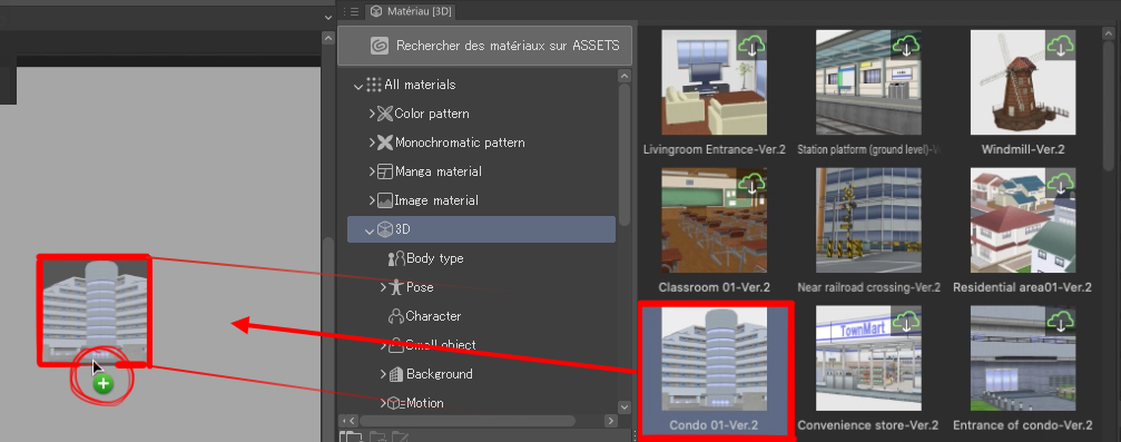 Pour ce faire, accédez à la palette Matériau (3D) et faites vos recherches dans les matériaux de CLIP STUDIO, sélectionnez une scène que vous aimez et cliquez dessus pour la télécharger gratuitement.