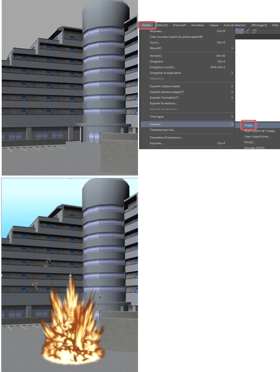 Placez l’environnement dans une perspective que vous aimez et importez (Modifier > Importer) le PNG de l’explosion que vous avez enregistrée précédemment.