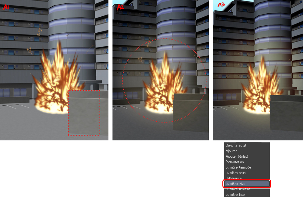 Dans ce cas, je l’ai placé à l’intérieur du parking. J’ai effacé la partie de l’explosion qui est cachée derrière la paroi avant (A1). Dans un nouveau calque, j’ai ajouté de la lueur avec l’outil Aérographe doux (A2) pour simuler la lumière du feu. Après cela, j’ai changé le mode de combinaison des calques en Lumière vive (A3).