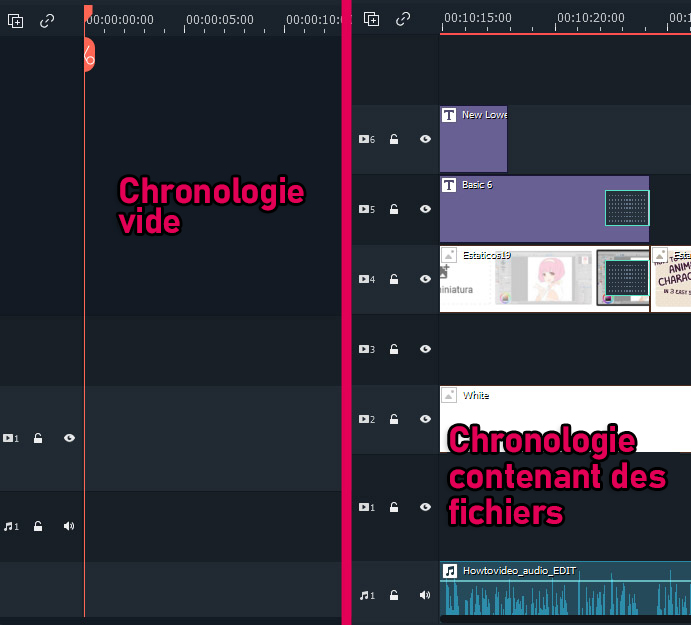 La plupart des éditeurs vidéo fonctionnent avec une chronologie dans laquelle vous commencez à ajouter vos images, vos fichiers vidéo et audio. Vous pouvez avoir plus d’une couche/piste de fichiers vidéo ou audio sur la chronologie afin d’avoir des images ou des sons qui se chevauchent (par exemple, si vous avez un fichier audio jouant de la musique sur une couche de la chronologie et que vous voulez qu’un son soit lu à une partie spécifique, vous devez l’ajouter sur une couche sonore différente afin que la musique ne s’arrête pas pour jouer le son).