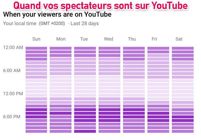 – Programmer. Vous pouvez décider d’une date et d’une heure spécifiques pour la mise en ligne de votre vidéo. S’il ne s’agit pas de la première vidéo que vous téléchargez, vous verrez des statistiques sur le studio YouTube vous donnant un indice des heures et des jours de la semaine où votre public est le plus actif sur YouTube. Cela peut vous aider à décider quel est le meilleur moment pour diffuser votre vidéo afin qu’elle soit vue par le plus grand nombre de personnes possible. Plus la couleur est foncée, plus le public est actif à ce moment-là.
