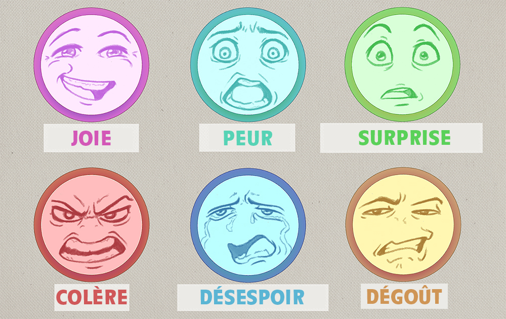 Joie, peur, surprise, colère, tristesse/désespoir et dégoût/répugnance.
