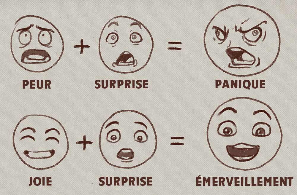 En combinant et en mélangeant, un nombre presque infini d’émotions différentes peut être développé. Des exemples de sentiments et d’états émotionnels combinés seraient : L’émerveillement, la panique, la haine, des grimaces, des larmes de joie, le désespoir, la nostalgie, la crainte et l’amertume.