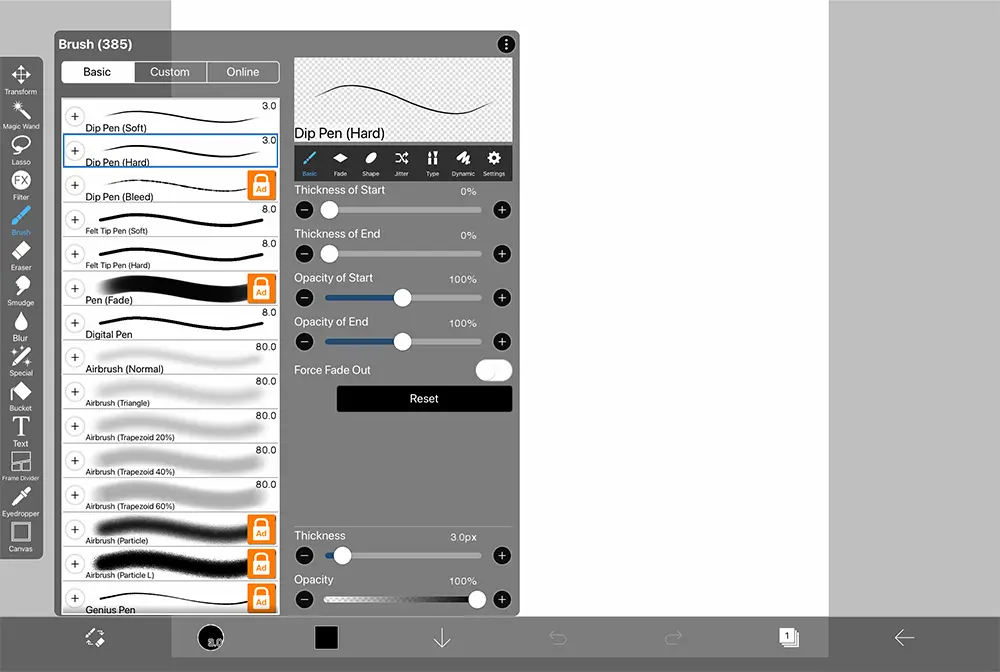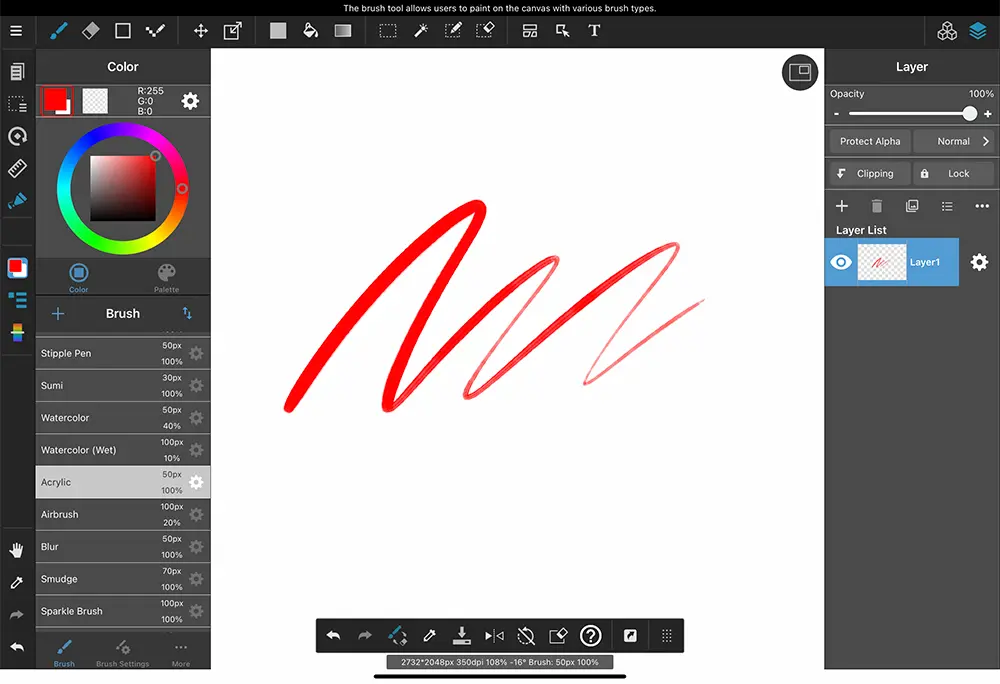 Les fonctions d’illustration de l’application sont très similaires à celles de Procreate et faciles à prendre en main pour les débutants. Cependant, de nombreuses fonctions d’illustration de Procreate, telles que les formes rapides, les outils de sélection, le déplacement et la mise à l’échelle, ne sont pas présentes dans cette application. Il manque également le studio de pinceau qui vous permet de personnaliser les pinceau, ce qui rend cette application globalement moins efficace en tant qu’application d’illustration.