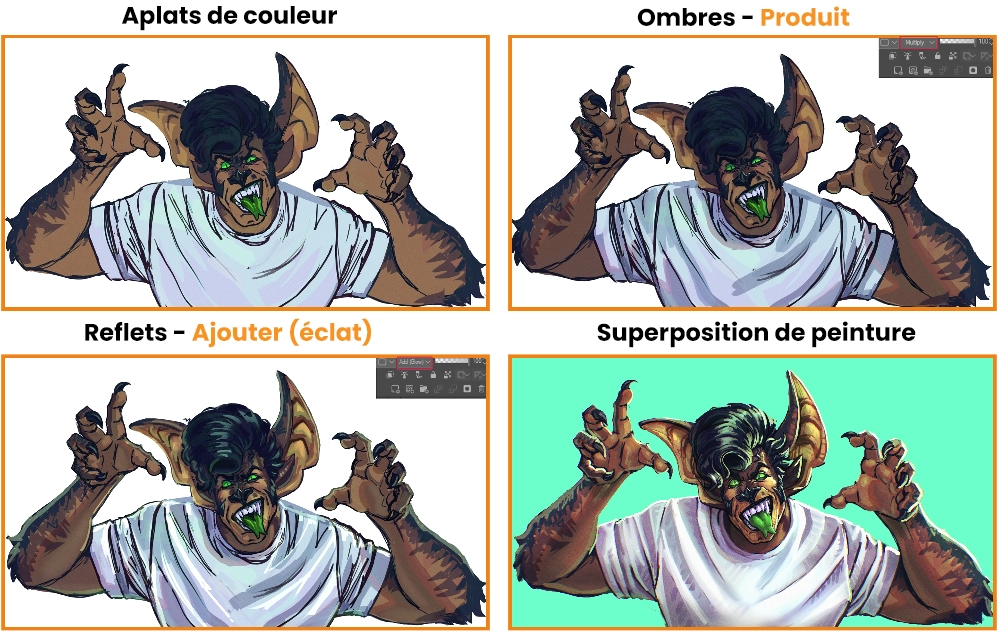 Je commence maintenant l’ombrage, en commençant par un calque Produit pour les ombres et un calque Ajouter (éclat) pour les reflets. Une fois tout cela terminé, je fusionne le tout et je peins par-dessus !