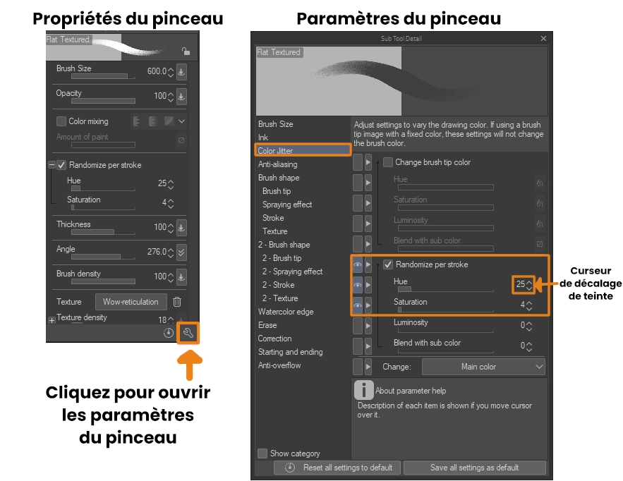 Vous pouvez trouver cette option dans les paramètres du pinceau en cliquant sur l’icône de la clé à molette.