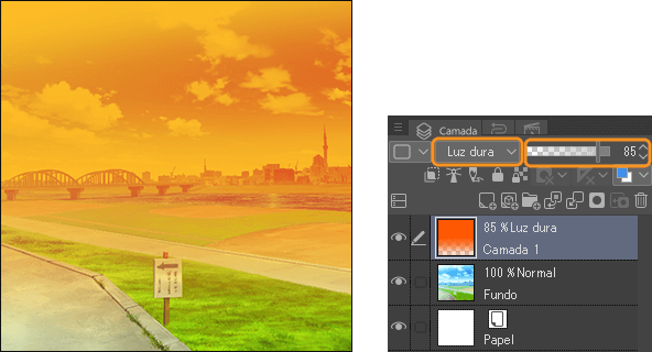 Selecione a camada com o gradiente laranja e defina o modo de mesclagem como Luz dura e, em seguida, reduza a opacidade para 85%.