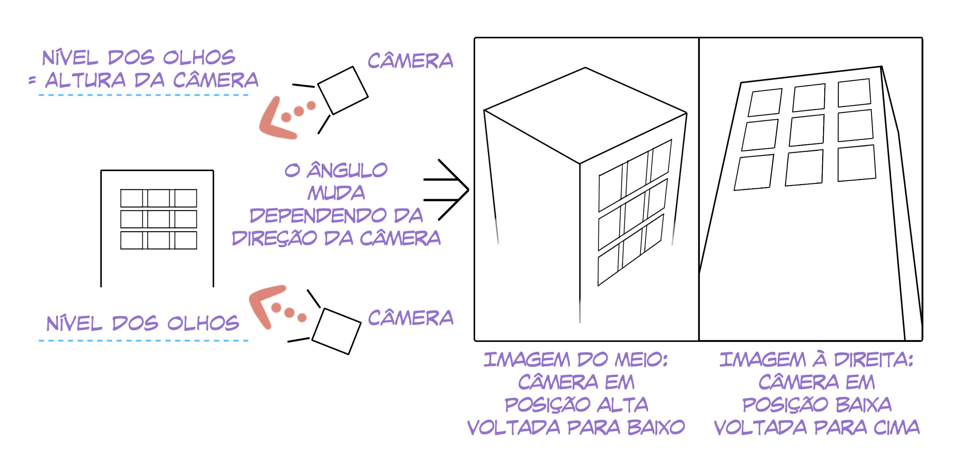 Ao desenhar desses ângulos, vemos uma forma de distorção chamada de “distorção por altura” . A perspectiva de três pontos é um método de desenhar essa distorção por altura.