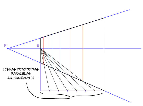 Desenhe uma linha paralela ao horizonte passando pelo ponto E, e então divida-a conforme a ilustração acima. Use os pontos onde as divisões encontram a linha que passa pelo ponto F para dividir o objeto. Fazer isso é útil quando queremos dividir um objeto em muitas partes iguais.