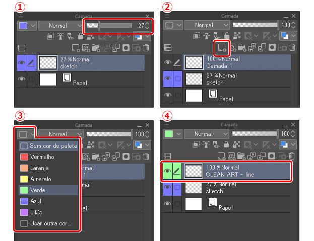 Agora que já temos a figura pronta, precisamos limpar nosso trabalho. Para fazer isso, primeiro reduzam a opacidade da camada de esboço para que ela não atrapalhe. Cerca de 20% a 30% deve bastar (1). Depois, criem uma nova camada clicando no botão exibido na imagem 2. Um bom truque de organização é dar uma cor específica a cada camada para conseguir diferenciar uma da outra rapidamente (3). Por último, deem um clique com o botão direito e renomeiem a nova camada como “arte limpa”; assim vocês saberão onde as linhas limpas devem estar (4).