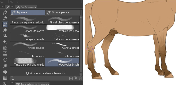 Ao trabalhar com diferentes tons de uma cor, meu conselho é usar o Pincel de aquarela com um tom que seja mais escuro que a cor de base do pelo para um sombreamento mais simples. Observem as seguintes imagens: