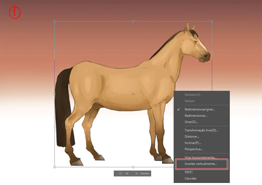 Em seguida, eu criei a sombra projetada (isto é, a sombra que o cavalo projeta sobre o chão) para adicionar peso e realismo à imagem. É aqui que a camada cinza duplicada do passo 6 vem a calhar. Eu transformo essa camada (Editar > Transformar), dou um clique direito na seleção e escolho Inverter verticalmente (1).