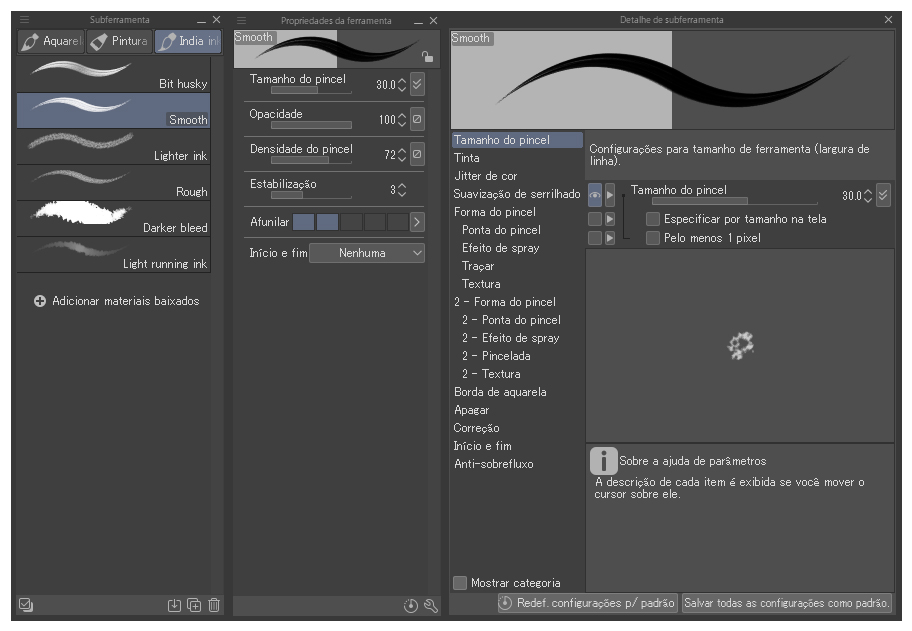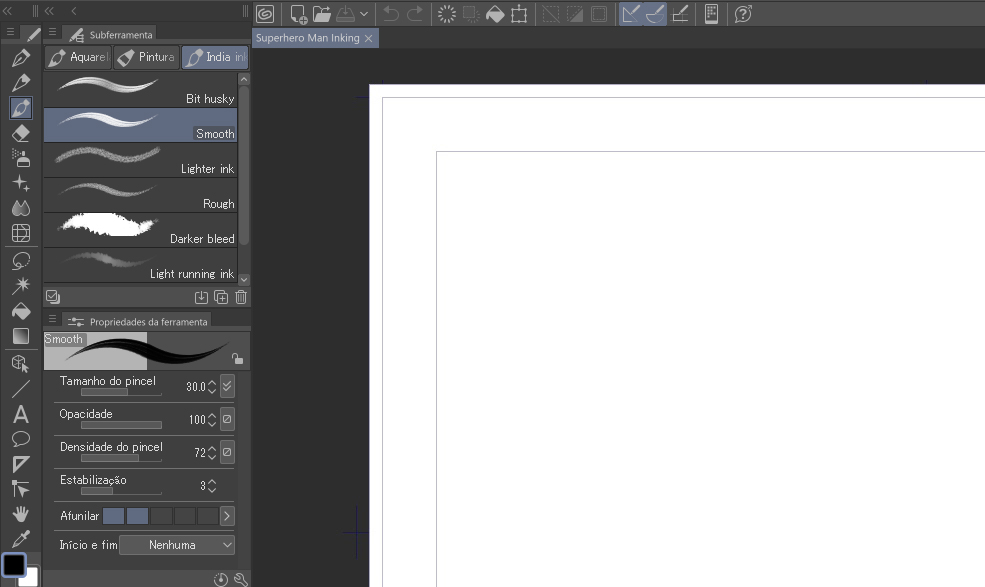 Logo de início, o Clip Studio Paint já apresenta uma variedade de pincéis de tinta nanquim que são ótimos para criar quadrinhos de super-heróis. Eu, pessoalmente, sou um grande fã de India Ink Smooth, graças às suas linhas limpas e textura sutil.