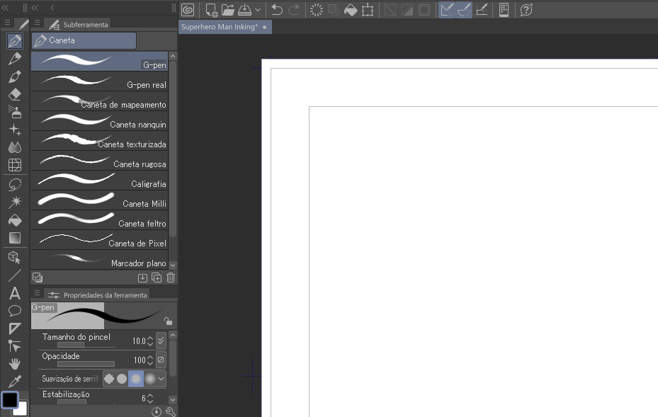 Para obter o visual de uma G-pen, não precisa procurar muito, pois há uma G-pen já integrada à subferramenta de caneta. Essa ferramenta garante linhas finas e bonitas se você aplicar pouca pressão, mas ainda assim pode expandir as linhas se você pressionar com força, embora não tanto quanto o pincel. Mas é isso que nós queremos, já que as G-pens também se comportam desse jeito na vida real!