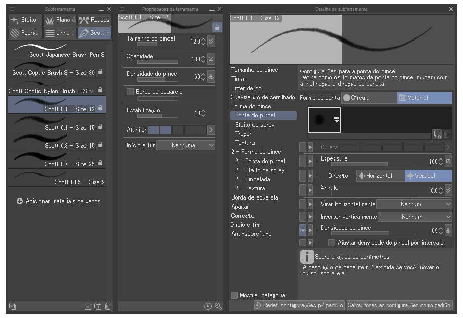 Por último, vamos falar sobre multiliners no Clip Studio Paint. Elas não estão incluídas por padrão, mas eu criei as minhas próprias, já que uso canetas desse tipo com bastante frequência em finalizações no mundo real. Você pode baixá-las no meu site no Gumroad aqui.
