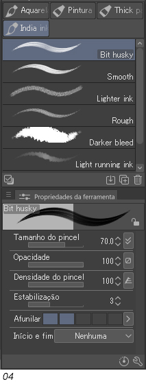 Para esta composição, vamos usar um pincel chamado “Bit Husky” da categoria de tintas nanquim (atalho “b”), também com as configurações padrões (fig. 4). O objetivo deste exercício é começar a cobrir áreas com tons que não sejam inteiramente uniformes.