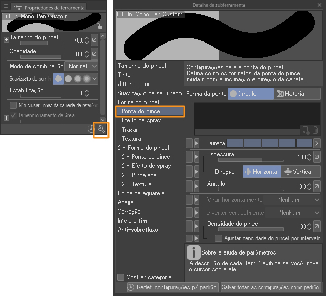Vamos começar com a “Fill-In-Mono Pen”. Dê um clique direito nela, selecione “Duplicar subferramenta” e depois a renomeie (eu renomeei a minha para “Fill-In-Mono Pen Custom”). Clique no ícone de configurações (canto inferior direito) e personalize o Marcador no menu “Ponta do pincel” com as seguintes configurações (fig. 8):