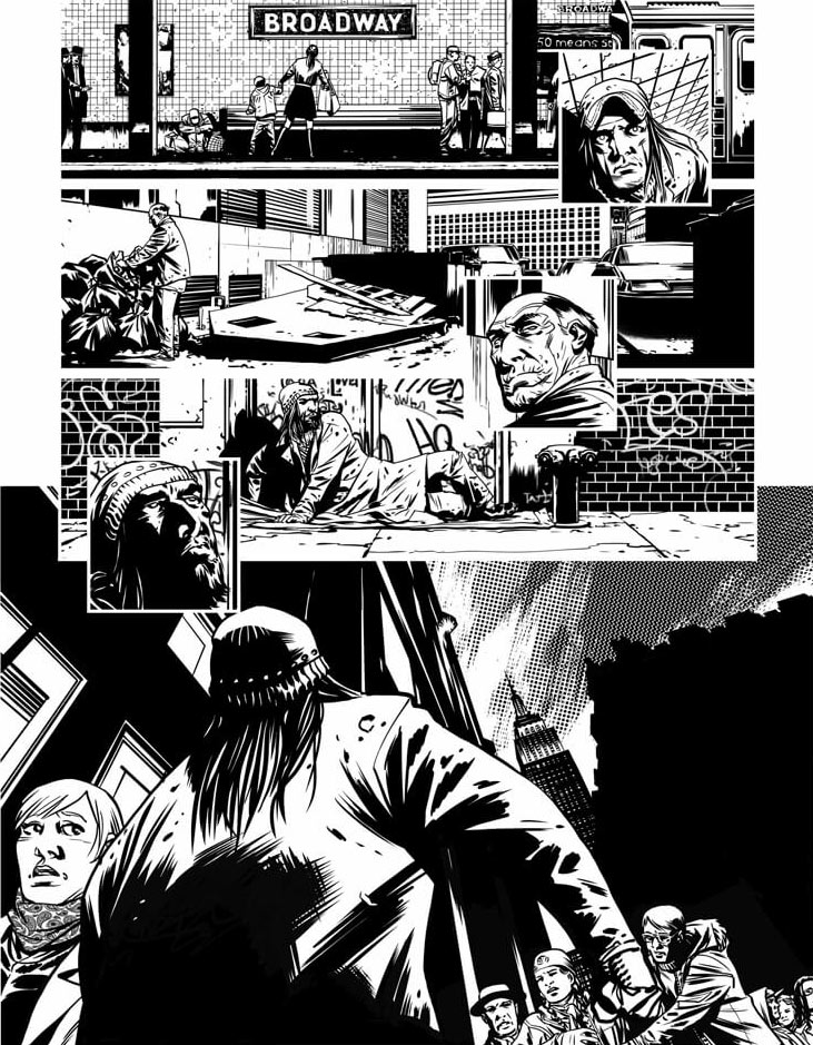 In der folgenden Comicseite wird die Perspektive genutzt, um die Skalierung des Gebäudes auszudrücken und das Gefühl der Einsamkeit der Figur zu betonen, wobei die Kamera leicht über der Figur platziert ist.