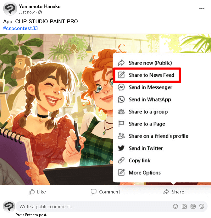 Folge der offiziellen Seite von CLIP STUDIO PAINT (@celsys.clipstudiopaint) und reiche dein Werk mit dem Hashtag #cspcontest33 über die spezielle Facebook-Wettbewerbsgruppe ein.