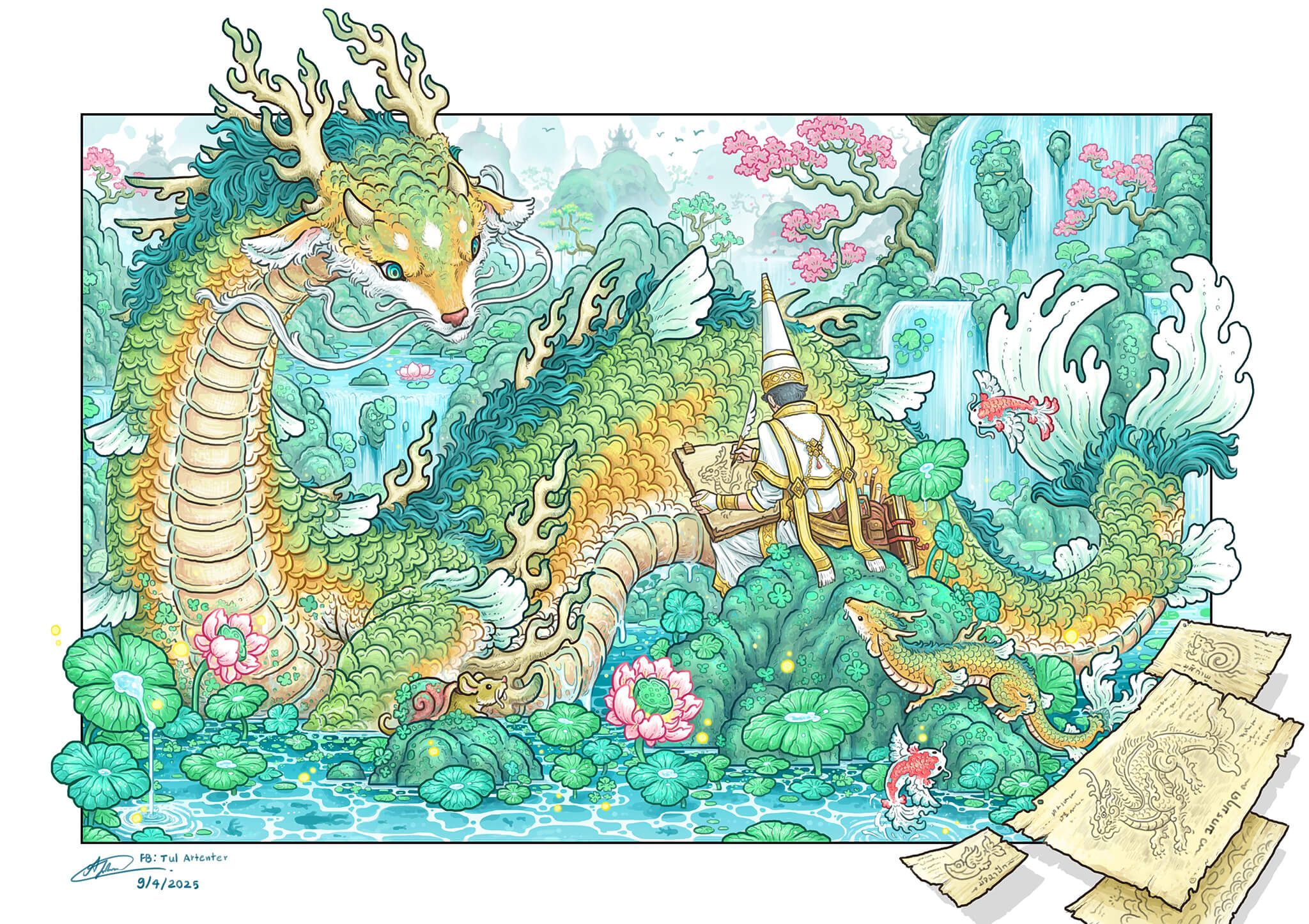 Die Farben und Linien sind raffiniert und vermittelten eine feierliche Atmosphäre. Ist die Person, die den Drachen skizziert, ein Botschaftssekretär? Ich würde gerne den Alltag dieser Welt erleben.