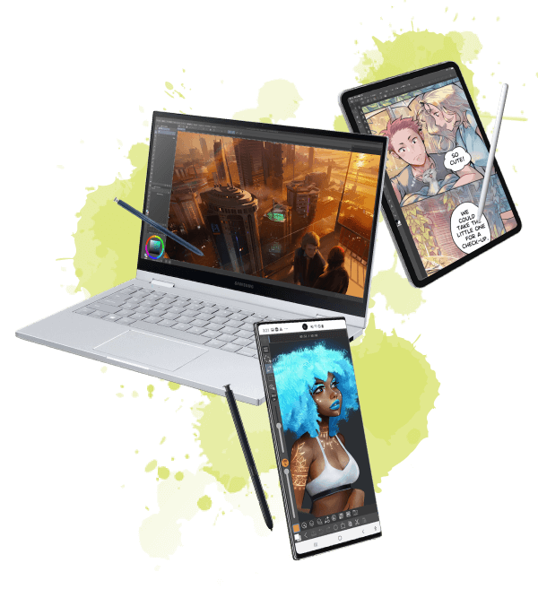 Verwende CLIP STUDIO PAINT DEBUT auf zwei Geräten (Windows/macOS/iPad/iPhone/Android) mit der Registrierung eines Nutzerkontos auf pixiv, eine Online-Community für Künstler.