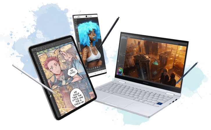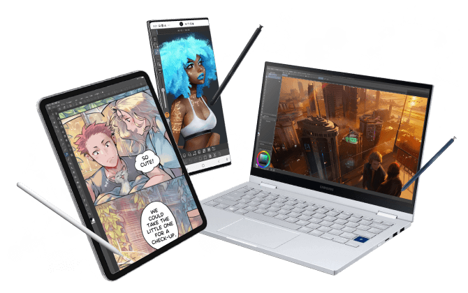 CLIP STUDIO PAINT ist für Windows, macOS, iPad, iPhone und Android verfügbar. Als Zeichnungs- und Mal-App für mehrere Geräte bietet es eine nahtlose Umgebung, in der Sie unterwegs auf Ihrem Mobilgerät skizzieren und zu Hause oder im Studio auf Ihrem PC an demselben Projekt weiterarbeiten können.