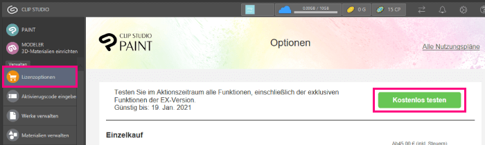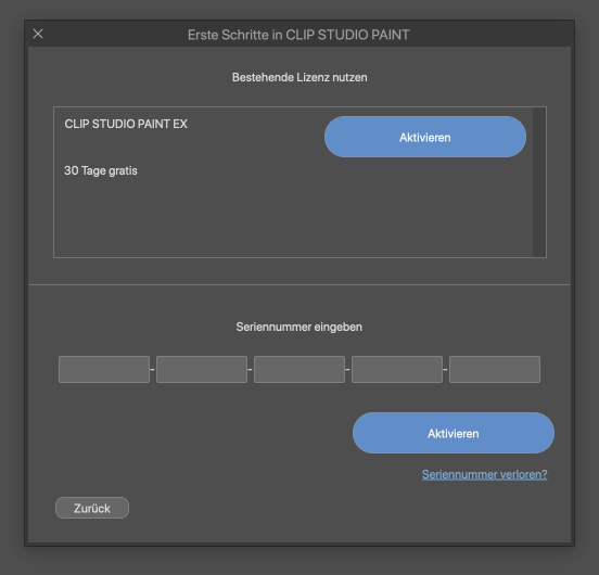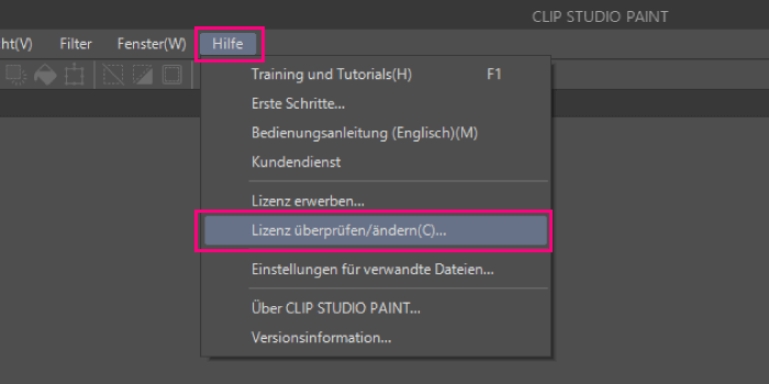 Klicken Sie auf [Aktivieren] des 30 Tage gratis von CLIP STUDIO PAINT EX im [Hilfe] Menü > [Lizenz überprüfen/ändern] > [Bestehende Lizenz nutzen].