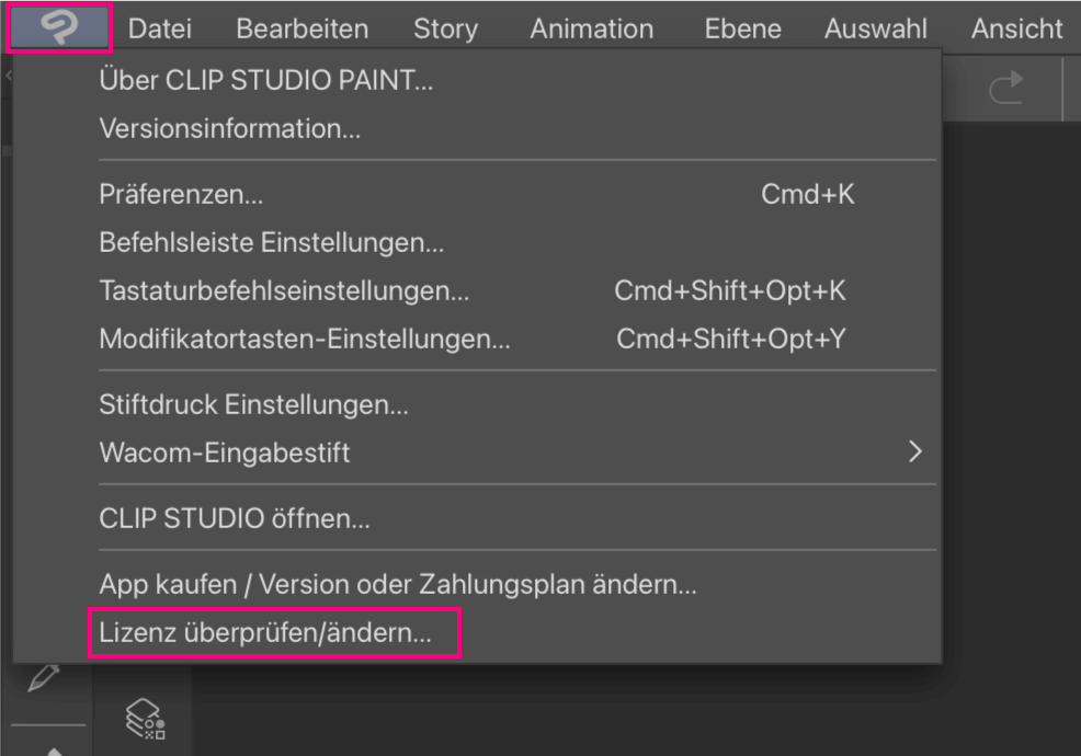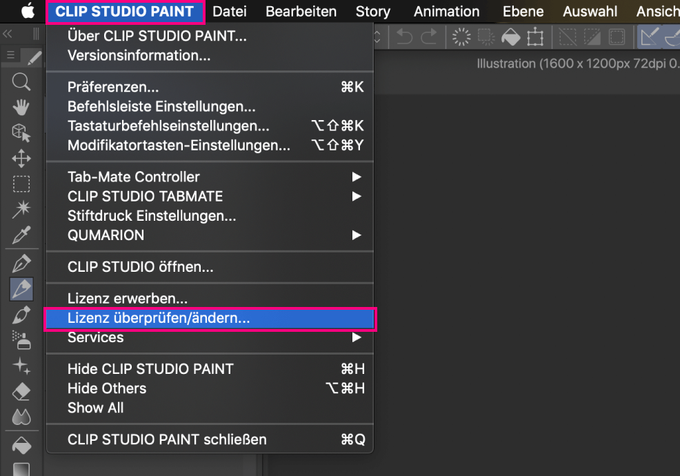 Klicken Sie auf [Aktivieren] von CLIP STUDIO PAINT PRO im [CLIP STUDIO PAINT] Menü > [Lizenz überprüfen/ändern] > [Ihre Lizenz].