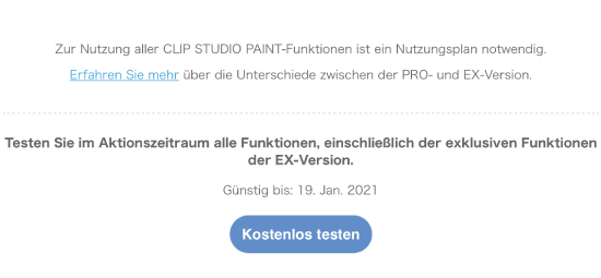 Benutzer von CLIP STUDIO PAINT PRO (Windows/macOS/iPad) können von heute bis zum 19. Januar 2021 (Dienstag) alle Funktionen ausprobieren, die nur für die EX-Version von CLIP STUDIO PAINT verfügbar sind. Nutzen Sie diese Gelegenheit, um Ihre Arbeitsprozesse mit den vielen Funktionen von CLIP STUDIO PAINT EX noch effizienter zu gestalten.