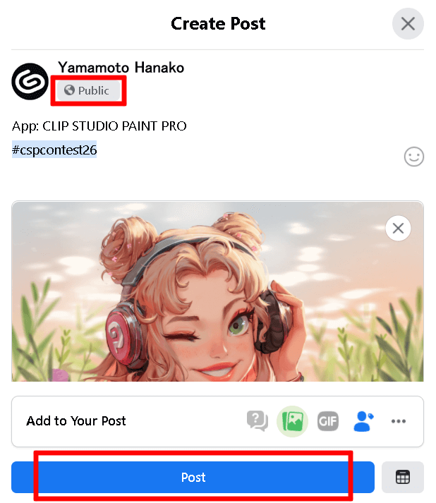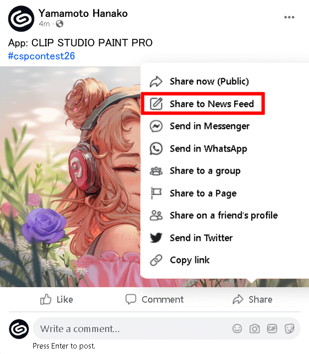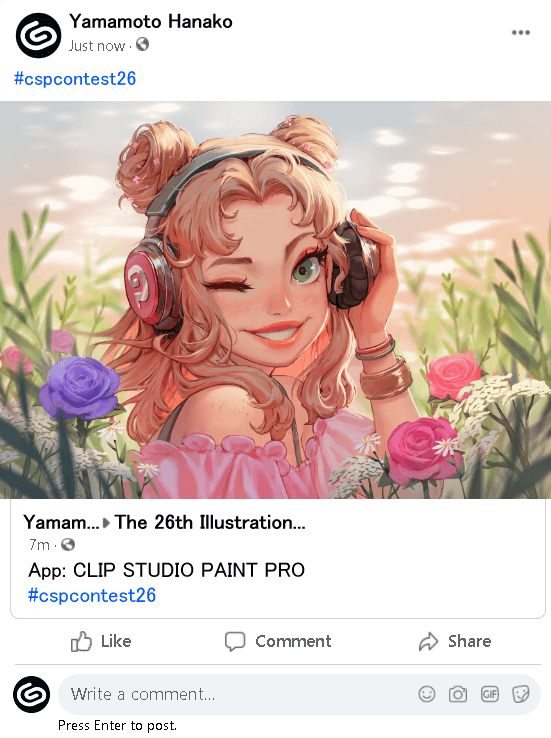 Folgen Sie der offiziellen Seite von CLIP STUDIO PAINT (@celsys.clipstudiopaint) und reichen Sie Ihr Werk mit dem Hashtag #cspcontest26 über die spezielle Facebook-Wettbewerbsgruppe ein.