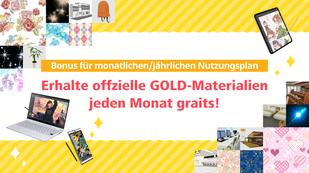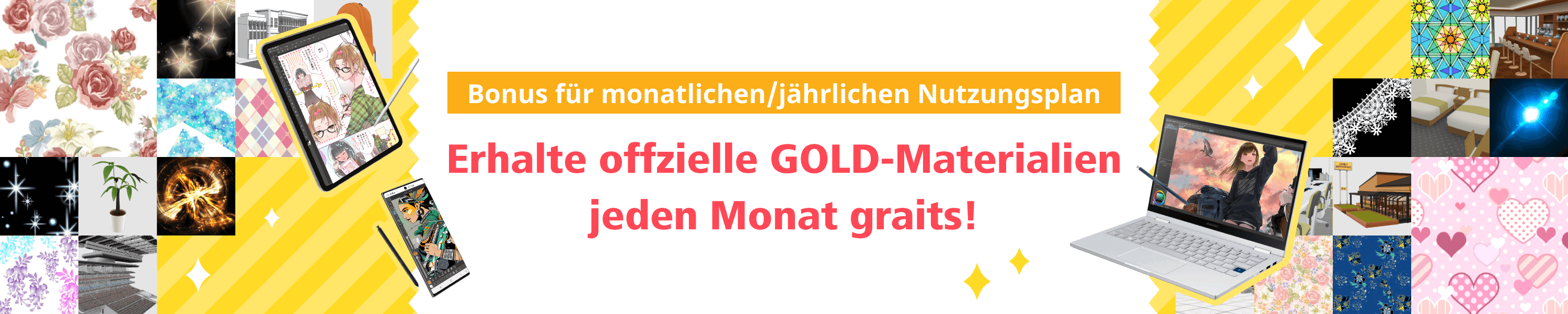Derzeitige Nutzer der monatlichen/jährlichen Nutzungspläne „Single-Plan“, „Dual-Plan“, Premium-Plan“ und „Smartphone-Plan“ sowie Neuabonnenten erhalten monatlich ein Geschenk ihrer Wahl aus den offiziellen GOLD-Materialien, die auf CLIP STUDIO ASSETS veröffentlicht wurden.
