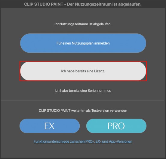 Öffne das [CLIP STUDIO PAINT] Menü > [Lizenz überprüfen/ändern] > [Bestehende Lizenz nutzen] und tippe auf [Starten], um CLIP STUDIO PAINT EX 30 Tage kostenlos zu nutzen.