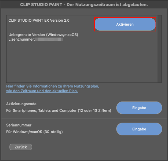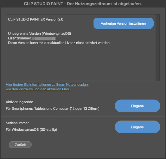 Wenn CLIP STUDIO PAINT nach Beendigung der Kampagne gestartet wird, erscheint das folgende Fenster, klicke auf [Für Lizenzinhaber] > [Verfügbare Versionen].