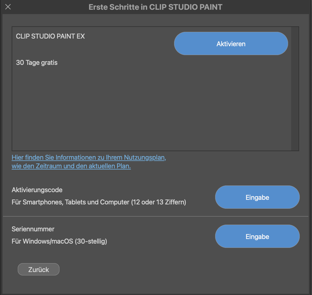 Starte CLIP STUDIO und klicke auf [Kaufen / Abonnieren] > [30 Tage kostenlos].
