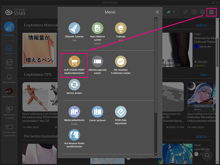Hier herunterladen - 2. Wechsle nach dem Start von CLIP STUDIO PAINT zur neuesten Version von EX