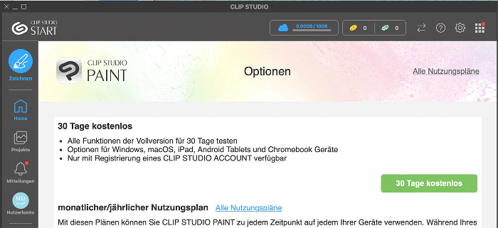 Starte CLIP STUDIO und klicke auf [Kaufen / Abonnieren] > [30 Tage kostenlos].