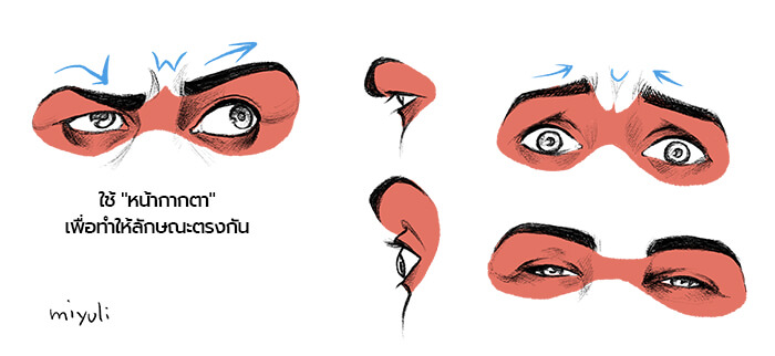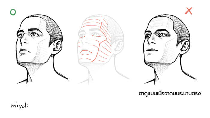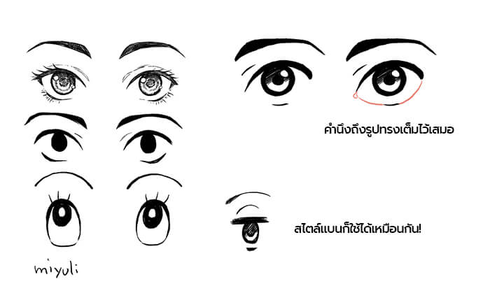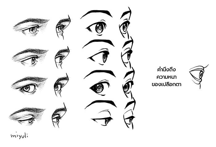 โดยเฉพาะเมื่อวาดตาจากมุมมอง ¾ จะต้องจินตนาการถึงพื้นที่ทรงกลมที่ดวงตาขยับอยู่ ให้คำนึงถึงความหนาของเปลือกตาด้วย
